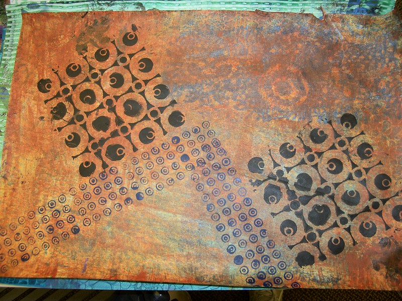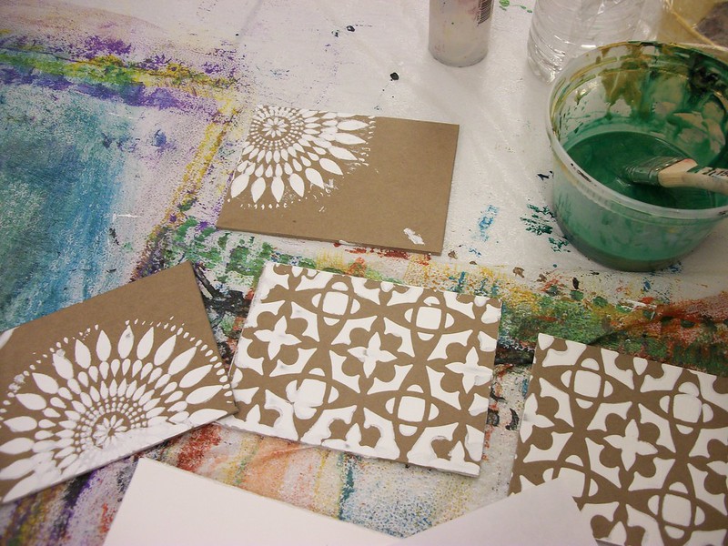 Stenciling gesso onto bookboard makes both a nice raised design and a resist.