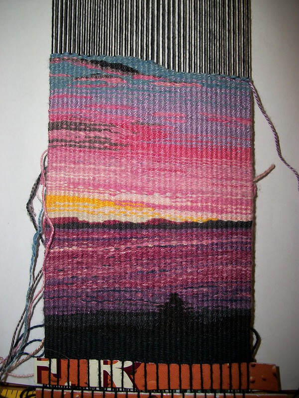 About half of this silk weft was handspun by a group of women in the mountains of, I think, Colombia. It was a project sponsored by a US group to set a community up with a legal and sustainable business in an area where lots of coca is grown. Unfortunately, the US also blasted them with paraquat so I think that they were not able to continue. They were raising silkworms and learning, so some of the silk was badly spun. But I was happy with it for my purposes, because I like uneven textures and it was perfect for a cloud tapestry. I dyed much of it myself and rest of the silk is commercially dyed silk floss from Treenway Silks in British Columbia, on a cotton warp.