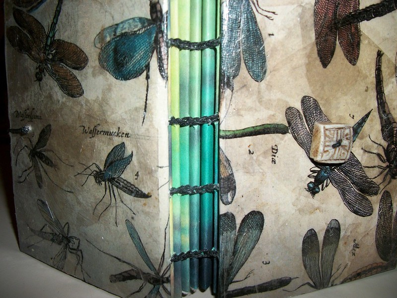 Mica dragonfly book with handmade Spanish moss paper by Susanne Martin, my handpainted papers, old print of dragonflies, mica layers.