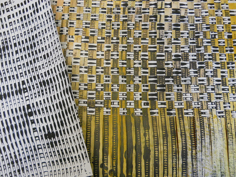 I’m not sure that I shared this before. This is a woven cloth strip square that I made a few months ago and overstitched with my new sewing machine, trying out the different stitches. The cloth strips are from the soy wax batik class that I took with Melanie Testa last year, and some onionskin dyed cotton.