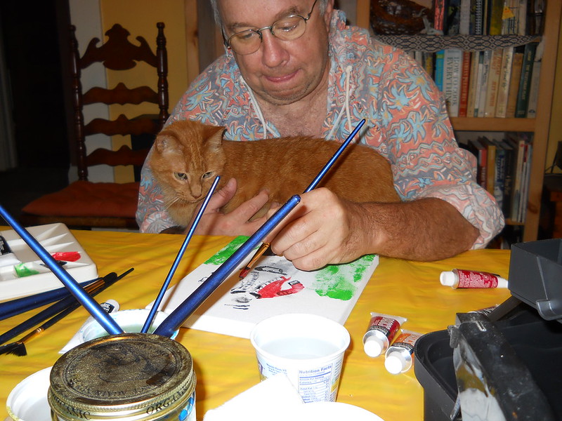 Sandy is very excited about painting now and I am thrilled to have an art companion! We cleared off the dining room table, put a plastic tablecloth over it, and had an art date yesterday afternoon. He has decided to try acrylics, and chose subjects that are definitely NOT beginner material, but the point is that he is enjoying it and I was quite impressed with his work yesterday. Of course, Theo had to get into his lap to check out his work.