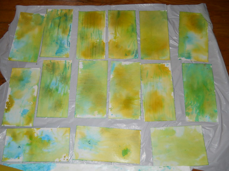 I finally washed some Stonehenge papers with acrylic paints for binding into journals. The trick with this is that you want it to be pretty, but not TOO interesting because the purpose is to write over these pages. I stack these with sandwich paper that I brought back from Albie’s class and the wrinkles of that paper and the plastic garbage bag that I laid them on made some wonderful effects. I guess that I’ll save the more interesting ones for endpapers or covers.