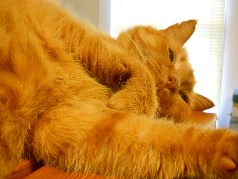 Theo is making me insane, though. I took him to the vet on Tuesday, thinking that his main problem was his anal glands. I changed their canned cat food because all three cats were rejecting it, which makes me concerned that there is something wrong with the batch. Now he is still jumping back from the food as soon as he smells it (the other cats are fine with it now) and he is licking and scratching and biting himself worse than ever. He is also smacking his lips a lot. I gave him a quarter of a Pepcid yesterday (something the vet told me to do for Squirt when he had stomach problems). He wants to be in my lap or on top of me or in my sight all the time. So I guess I’ll be taking him back to the vet for a steroid shot tomorrow and I bet that they will want to do blood work. I wonder if it is anxiety.