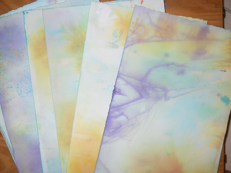 I finally washed some Stonehenge papers with acrylic paints for binding into journals. The trick with this is that you want it to be pretty, but not TOO interesting because the purpose is to write over these pages. I stack these with sandwich paper that I brought back from Albie’s class and the wrinkles of that paper and the plastic garbage bag that I laid them on made some wonderful effects. I guess that I’ll save the more interesting ones for endpapers or covers.