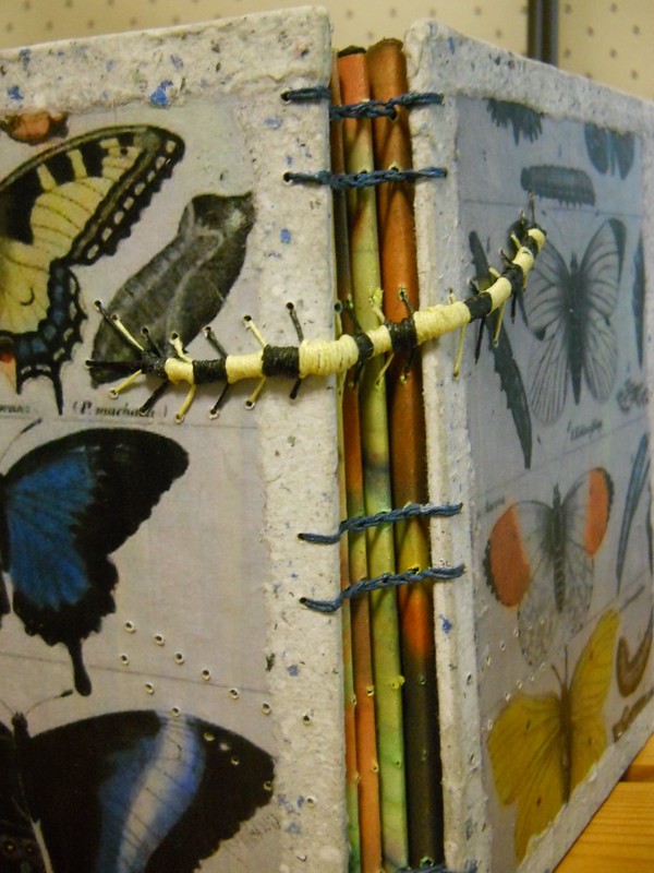 Another caterpillar stitch across the spine (see the holes between the blue butterflies) and a closure and this one will finally be ready for the gallery.