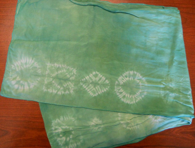 Rayon scarf: Different stitched shapes stitched on a fold, drawn up, and dyed. It’s in a bucket with green walnuts and water on the deck right now. Already there are some interesting marks on it.