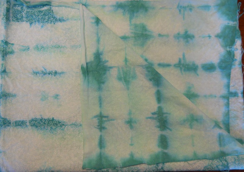 Turquoise folded pattern: This is interesting cloth. A delicate white pattern that must be made with a polymer of some kind on white cotton. The cotton takes the dye, the pattern does not. Pleated, folded, and clamped.