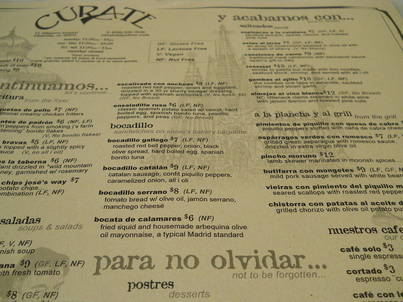 On Saturday night we picked Cúrate, a Spanish tapas restaurant near Pack Square on Biltmore Avenue. It was a delicious, beautiful, and unusual experience for us. We sat at the bar and watched the chefs bustle through their orders. Next time I will definitely try their ham, which is their specialty. And cheese. I love manchego cheese.
