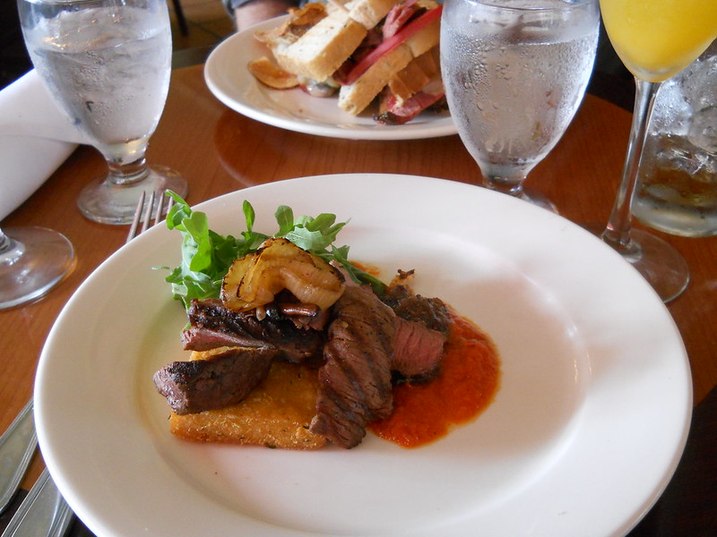 The next day, we had brunch at Solace, also in downtown Asheville. I don’t know, is 2 p.m. still considered brunch, or is it lupper/linner? Sandy had a pastrami sandwish, and I had antelope and polenta and most refreshingly, mimosas.
