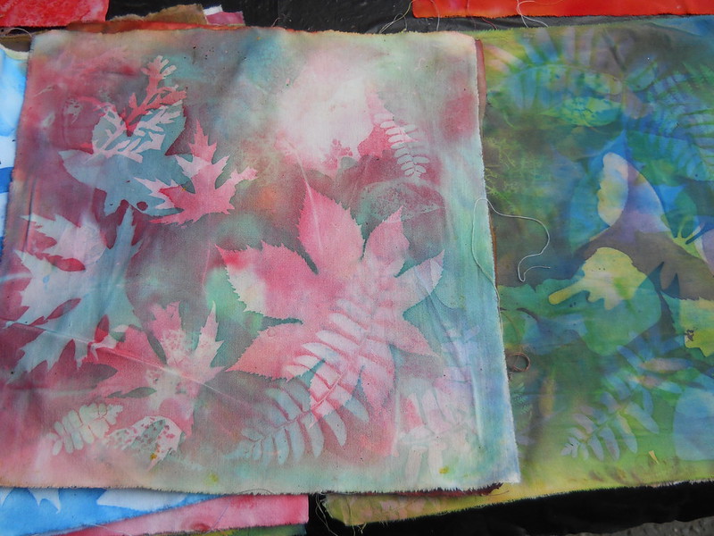 On Sunday, our first stop after a lazy morning in bed was the Folk Art Center on the Blue Ridge Parkway. Murphy fiber artist Sandra Rowland was one of the featured artists and she was demonstrating sun prints on fabric outside. Her quilts were fabulous because of her richly hued nature printed fabrics, but I wasn’t allowed to photograph inside. I bought one of her printed squares to include in my Magic Diary Cloth. She was also fun to watch and generous with her information.
