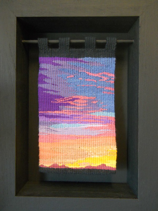 Cotton warp, mostly silk weft – some handspun and hand dyed – hanging in wooden shadowboxes. Each tapestry measures about 7 1/2 x 4 1/4 inches.