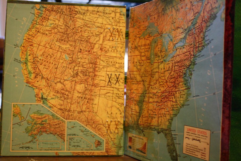 I just bought a wonderful book by Jill Berry titled Personal Geographies. I have always been fascinated with maps, as long as I can remember, really. The World Book Encyclopedia was my playground, and the maps were my very favorite parts. I made up different map games to amuse myself. I pick up maps everywhere I go today.