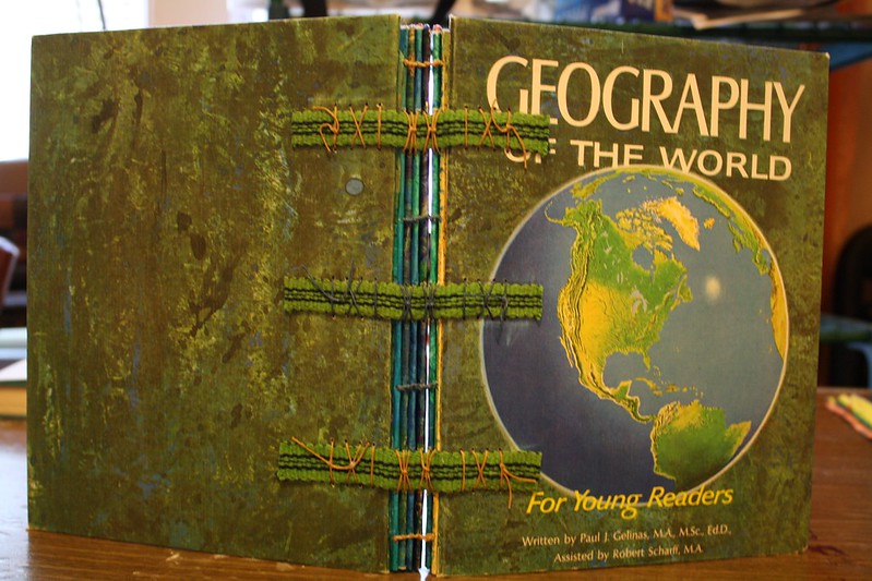 So I reappropriated this altered geography book with painted pages for my personal geography journal, and I’m going to do the exercises in her book. I spent yesterday (between headaches – Sandy and I are both sick with colds) reorganizing and cleaning out my hoard in the bedroom studio and lo and behold, there is actually a space on my worktable on which I can see the table surface, a big enough one that I can use! This time I hauled out everything, sorted it into piles, made labels to put on the drawers of my art chest, and I am going to try really hard to put things in their places now, and not toss everything in the “Misc. Craft Supply” drawer, although, you know, I am human.