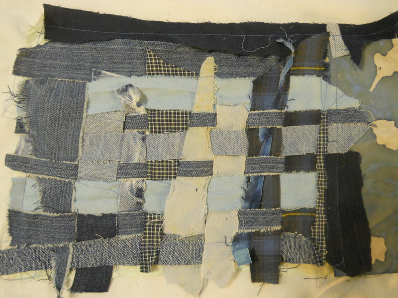 This boro square is woven with recycled jeans and a square of fabric I soy batiked a couple of years ago in Melanie Testa’s class and then dipped in black walnut dye. Always keep your paper and fabric work that you are less than happy with, because you can always use them for layered or woven projects. Layers = richness. This is a base cloth for further work and a larger project, as is the next one, woven with mostly recycled clothing from our closets.