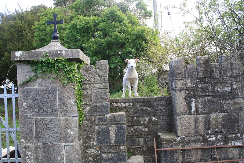 We meandered to the south on Tuesday, nearly a full day of driving. In County Meath close to Newgrange, we stopped at a spinner/weaver’s farm and shop, Boyne Valley Wools. Her work was beautiful and inexpensively priced, and if she had taken credit cards or if I had had cash I would be the proud owner of one of her scarves. Her farm was also interesting because it was in view of Newgrange and had an old cemetery on it where the lambs played. There was also an old stone bridge that no longer crossed water.