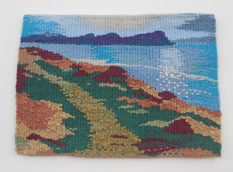 “Dingle Cliff Walk,” tapestry. Cotton, linen, and silk; 6 x 8.75 inches. Tweaked the finishing touches today.