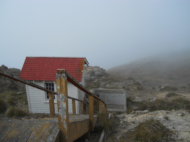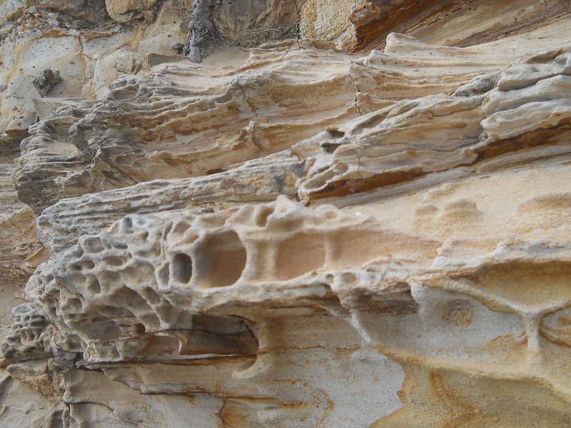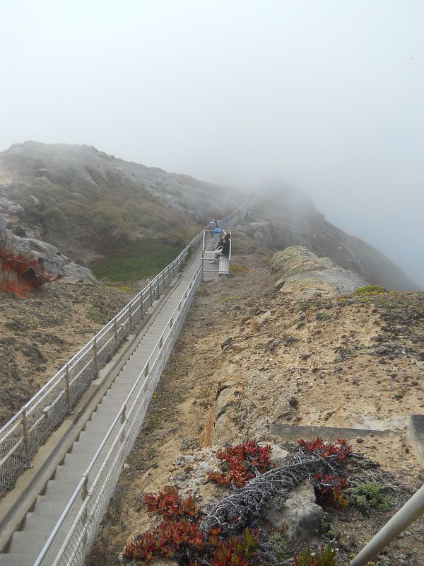 Not quite ALL the way to the lighthouse. It was very foggy and you could barely get a fleeting occasional fuzzy glimpse of the waves beneath the cliffs. Since the steps down to the lighthouse itself was the equivalent of a thirty story climb, we decided to skip it. You know how I love wind and water shaped rock? That was a good place for it, high above the Pacific Ocean.