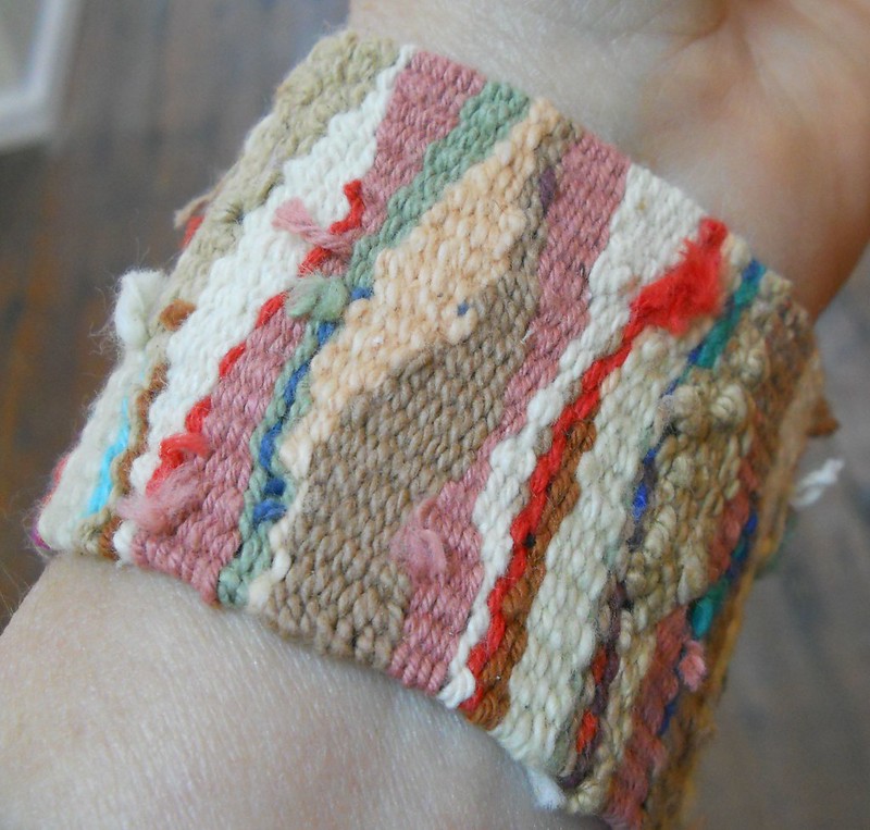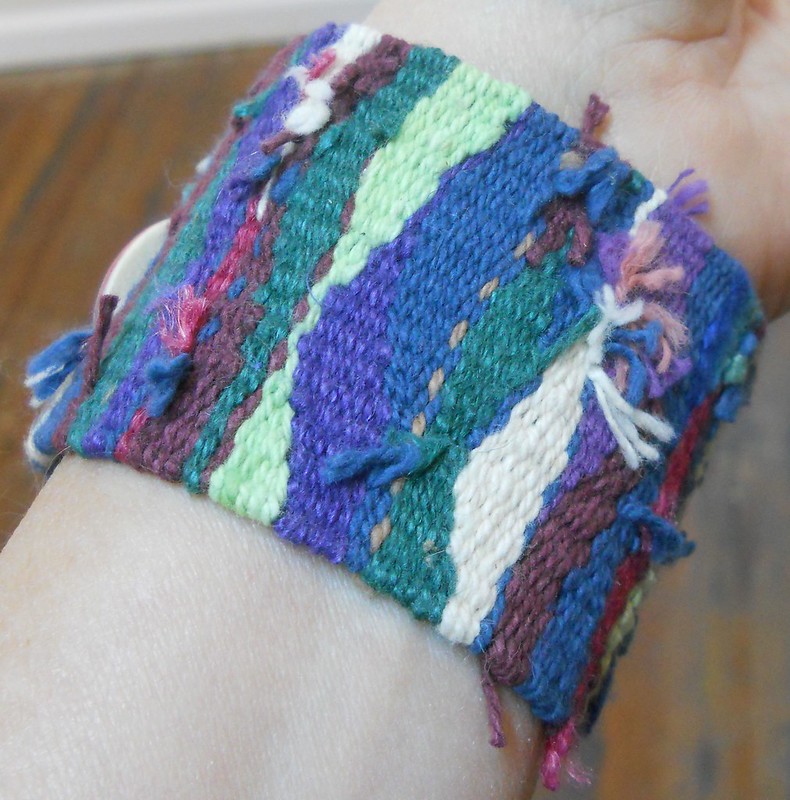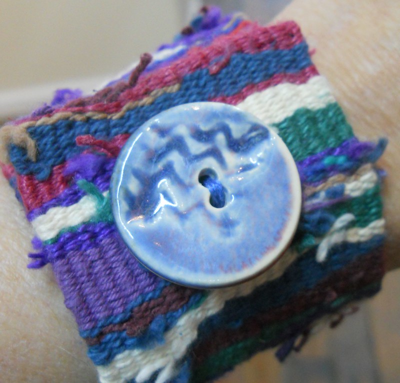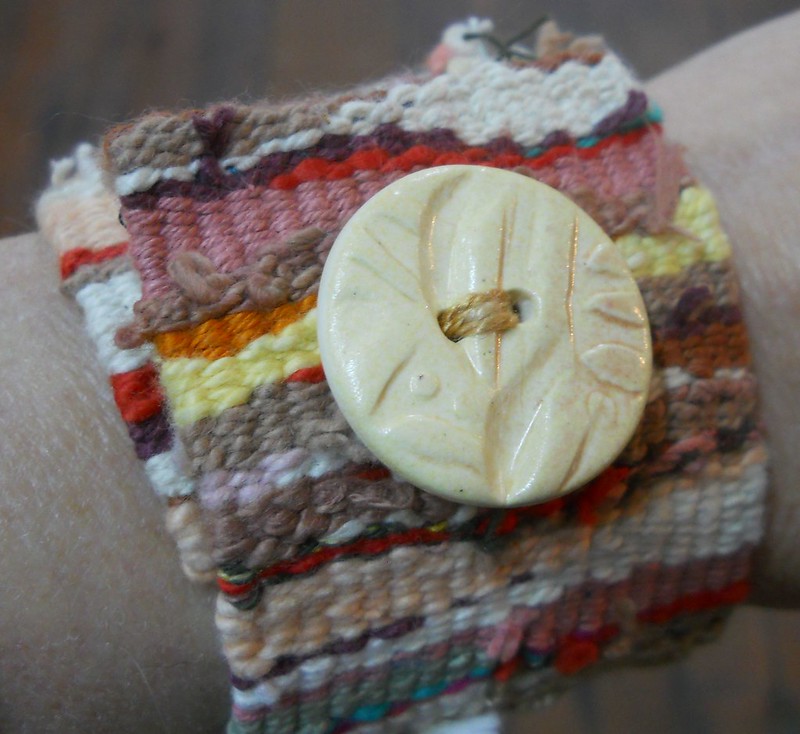 Handwoven by me – mostly cotton, soft and comfortable. Buttons made by Homeplace Pottery. The buttons are decorative. The cuffs close with velcro. $40 each, on sale at Elements Gallery.