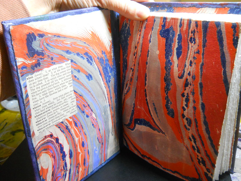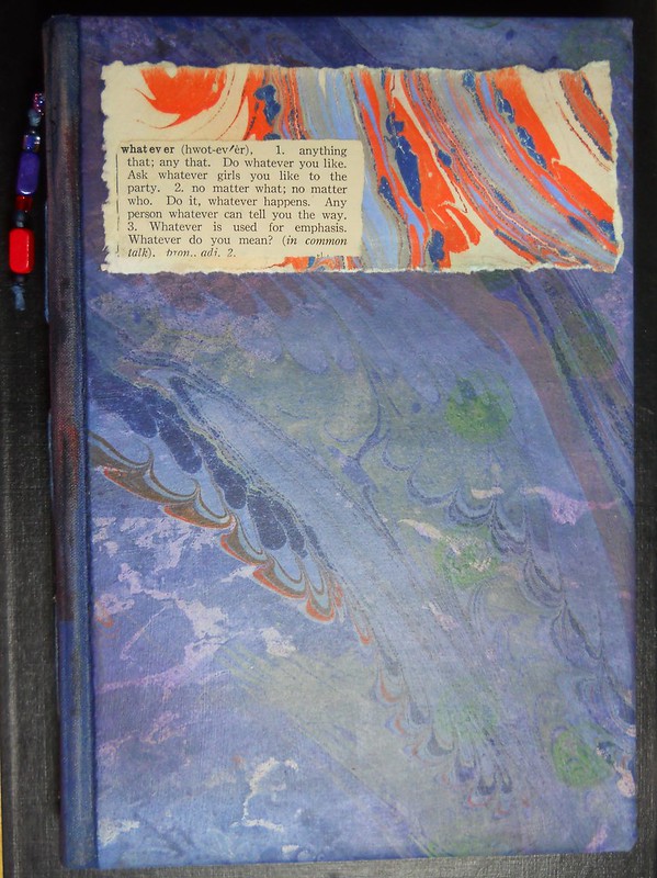 The book cover is upcycled from a novel titled “Eden’s Lost.” I left the title on the spine barely visible. I like to retain a bit of the original book somewhere when I upcycle it. The binding is longstitch; the paper is Stonehenge. Dictionary page entries collaged on the cover (inside and out) are for “whatever” and words with “when” and “where.” I call it the “Whatever” book because the pages are suitable for whatever you’d like to do with it, but I also chose that word because I had just read that the word “whatever” had been voted the most annoying word for several years in a row. I can understand why, but sometimes I get annoyed at the contortion of a perfectly fine word’s meaning and wish to restore its reputation. I guess that it is part of my love affair with words.