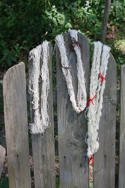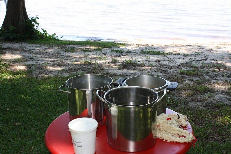 This time I’m taking the opportunity to concentrate on natural dyeing with the tannin-infused water of Lake Waccamaw to mordant my fibers. Hopefully, if I will maintain a wifi connection and the camera cooperates, I’ll document it here. This morning I am getting started by washing the silk and wool that I wound into skeins for dyeing with Ecover delicate wash detergent. I bought this silk on the cone from Colourmart and this is the first time that I have worked with it. It has to be scoured before dyeing. I bought the handspun wool from a vendor at the Greensboro Farmers’ Curb Market. I don’t remember the name of the farm and will add it later when I get home. The rest will be fabric remnants and scraps from my stash.