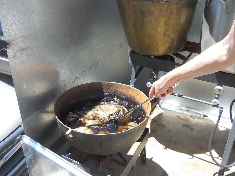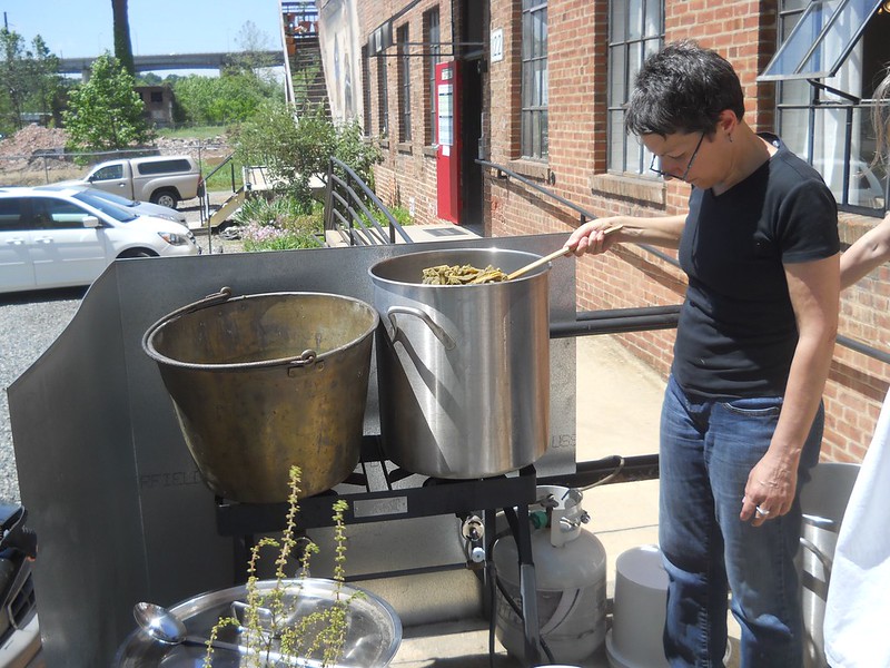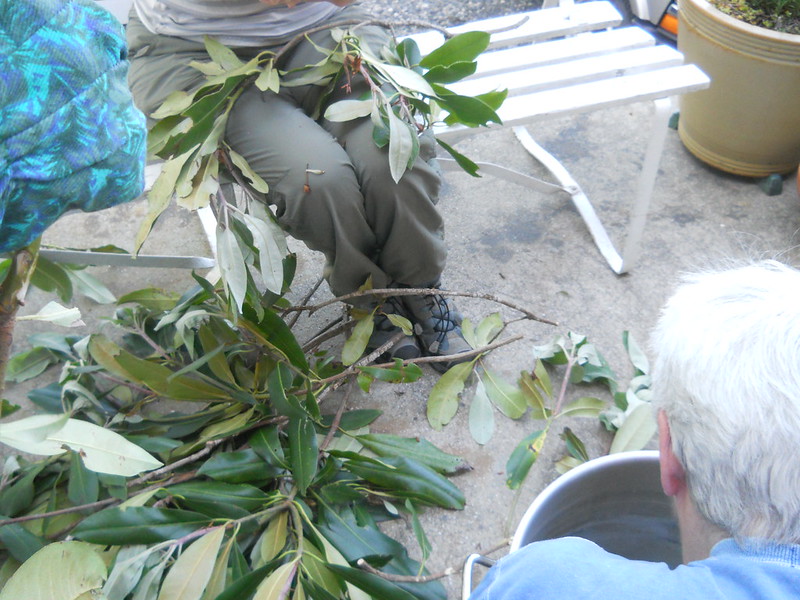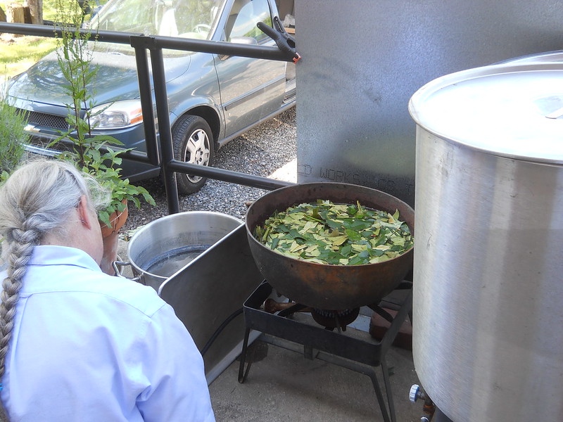 Preparing the rhododendron leaves while our fabrics and yarn skeins soaked in a mordant bath with alum. We only used the older leaves, not the new, sticky shoots and new leaves. The breeze felt great but it kept blowing out the gas stoves.