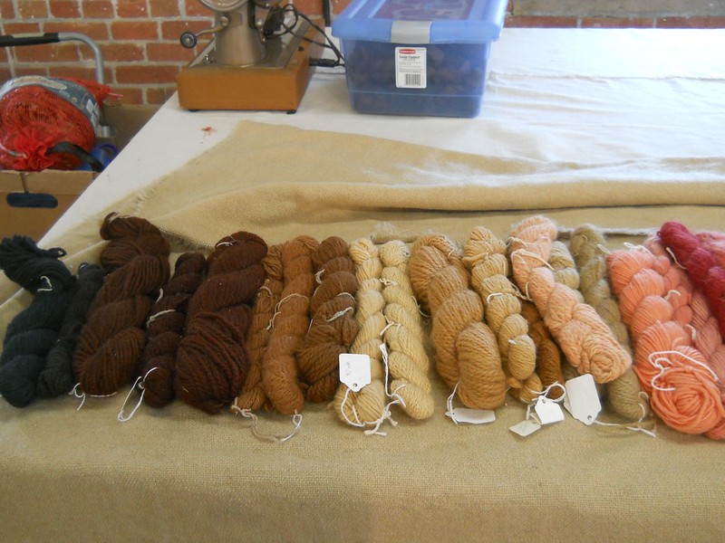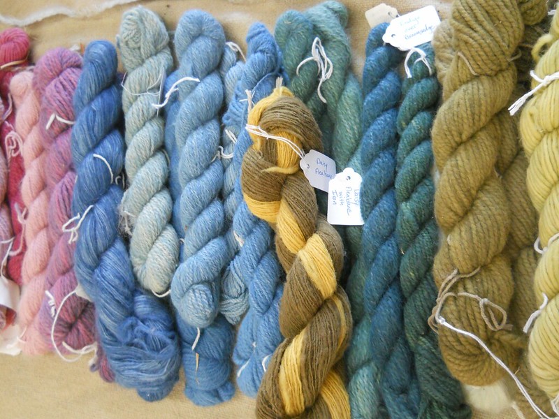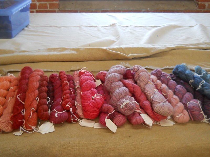 Here are the yarn samples Eileen and I got with the rhododendron dyepot. Top to bottom: silk, wool, and cotton.