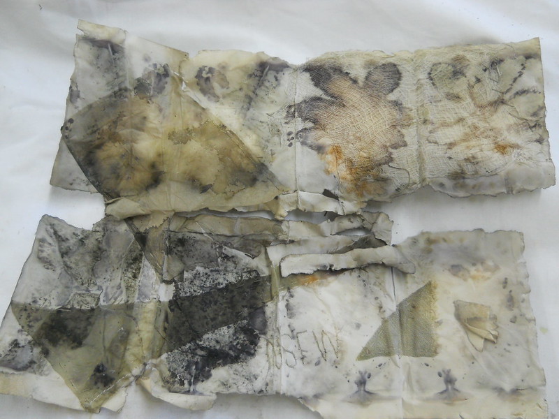 I don’t mind that I nearly destroyed the La Pointe Cemetery papers through impatient handling and poor protection in the dyepot – the beautiful decay is fitting for the object’s inspiration.