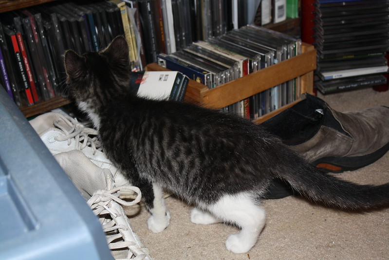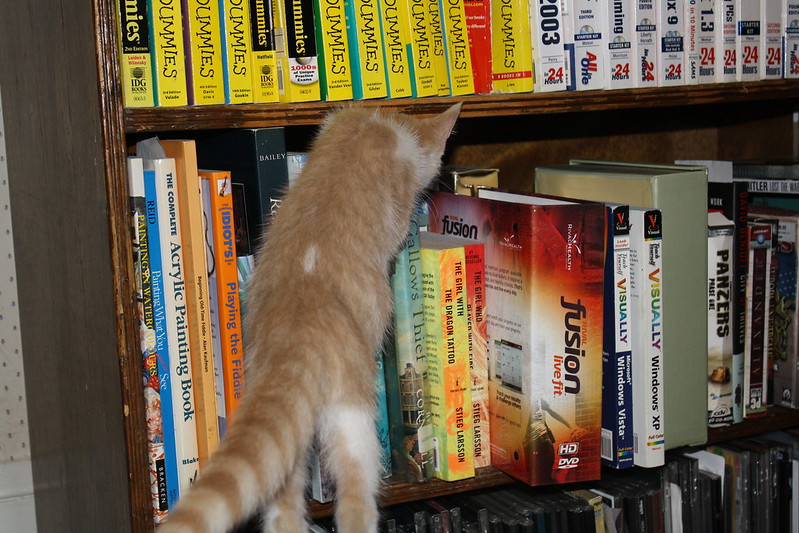 Right now, these two one-month-old boys are known as “the fosters.” The only time I could get decent photos were when they stopped running long enough to explore and decimate Sandy’s bookshelf. They’ll spend a few days on their own behind closed doors (or as long as I can stop Sandy from letting them out) and then they get to terrorize Theo and Miss Lucy.