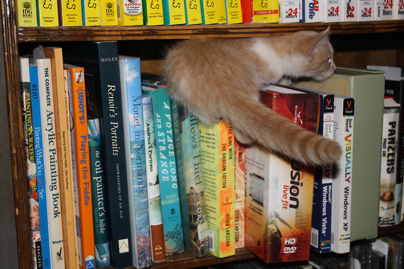 Right now, these two one-month-old boys are known as “the fosters.” The only time I could get decent photos were when they stopped running long enough to explore and decimate Sandy’s bookshelf. They’ll spend a few days on their own behind closed doors (or as long as I can stop Sandy from letting them out) and then they get to terrorize Theo and Miss Lucy.