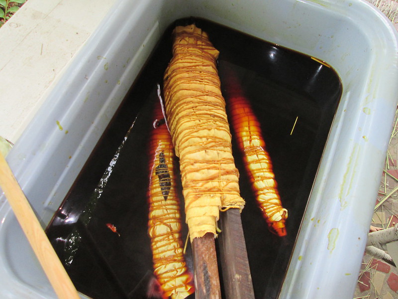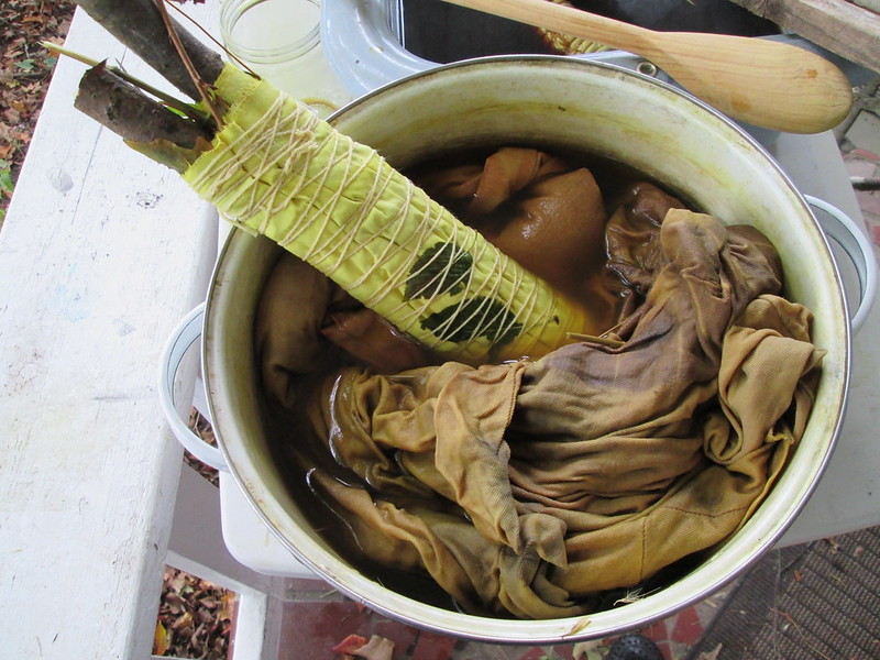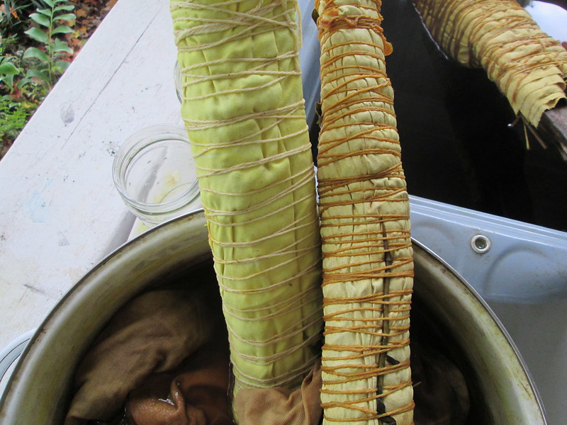 I have left the lighter bundle in the dyebath until later. It is not part of my farm-based project, and has plant material gathered from my front yard wrapped in cotton alum-mordanted fabric on sticks from the yoshina cherry trees (maple leaves, yoshina cherry leaves, yarrow, echinacea, rudbeckia blossoms, various weed leaves inside). The other fabrics are a long cotton t-shirt and a bamboo knit mock turtleneck that I keep overdyeing just for kicks.