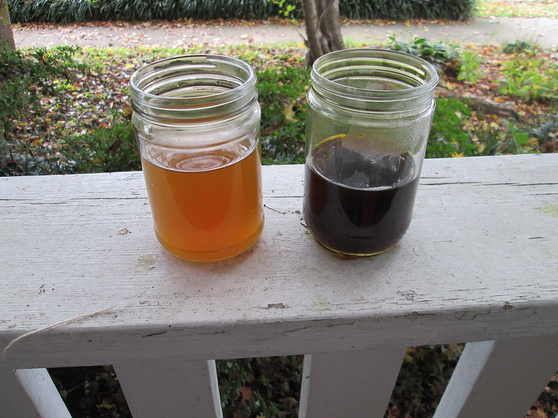 I made two dyepots for comparison. One was with the dried broomsedge that Dede Styles gave me in June. It was harvested about a year ago. The other was with broomsedge that I gathered two weeks ago from the farm. The colors of the two dyebaths were strikingly different, but the colors of the cloths coming out were not hugely different: