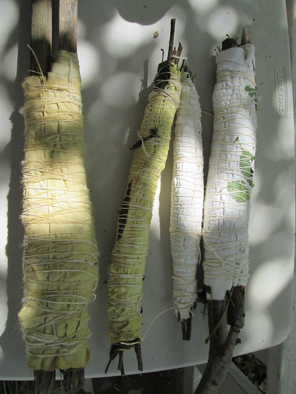 So I unwrapped the bundle that had been previously dyed with goldenrod and washed and dried, but had no mordant. More color, but very few prints.