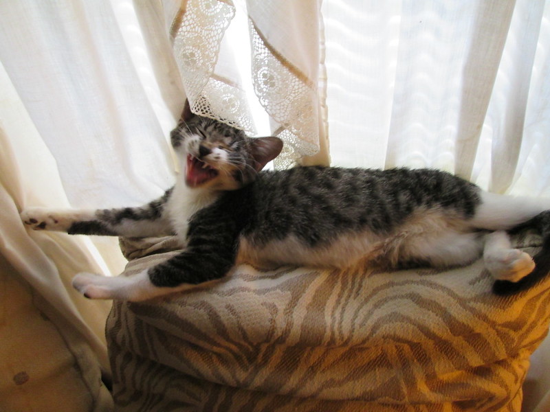 Lucy has adjusted well to the kittens and plays with them sometimes. She is fascinated with watching them and has a happy relaxed curled tail while she sits in the middle of the chaos. Poor Theo is the one I am worried about. He will occasionally lick their faces when they are calm but he doesn’t eat much. I give him as much attention as always and he sleeps beside me at night. I’m glad that he is overweight because mealtimes seem to be a source of stress and I have tried a lot of variations, including giving him a special treat before he eats to charge up his appetite. That seems to work best but not if he is running from me and hiding. It used to be that shaking the treat bag would bring him out of anywhere in the house anytime, but no more.