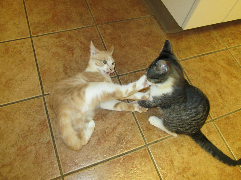 In good news, the boys, Pablocito Blondie and Diego Wolf, have had their final kitten checkups and vaccinations and are cleared for neutering on Nov. 20. They never stop playing, even in the vet’s office, and their coats are healthy and beautiful. They weigh over 6 pounds and 5 1/2 pounds. Theo has finally warmed up to them but he is getting attacked (playfully but roughly) and double teamed frequently. I had to break up the fight between Pablocito and Theo this morning because Pablo was not getting the message that Theo had had enough and I was afraid that another ragged tomcat ear would be the result.