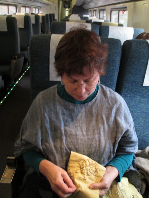 I had lots of time to stitch on my animal scroll on the train ride home because of several long delays.