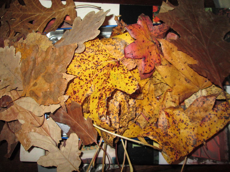 I’ve been collecting leaves just about every day, focusing on different varieties of oak leaves. Today I found some nice speckled sweet gum leaves outside the vet’s office. Leaf printing is on the schedule for the end of the week.
