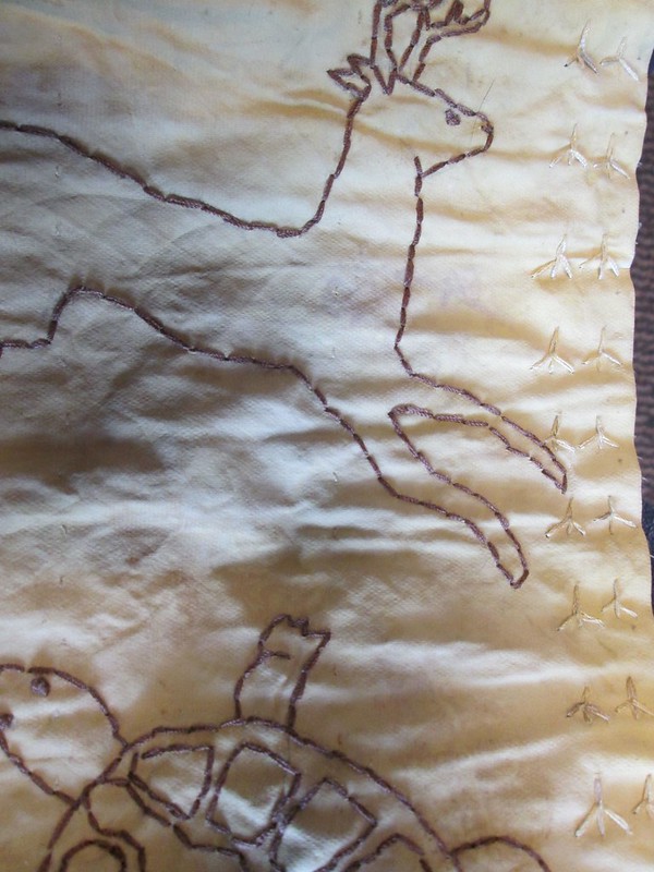Stitching little bird tracks on the farm scroll. I dye my silk thread by wrapping it around fabric bundles. The yellow thread was dyed with broomsedge, and the brown thread was dyed with black walnut hulls.