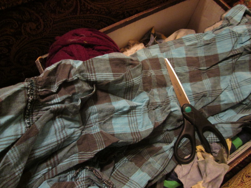 Cutting up clothes not good enough to donate for rag rugs and fabric weaving and collage.