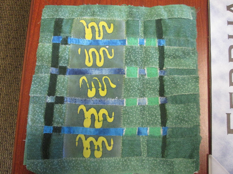 A woven cloth square with a soy batik sample that I made in one of Melanie Testa’s classes long ago.