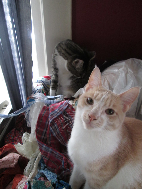 I have been wasting time on Facebook all morning, and once the kittens got quiet, decided to iron some fabric scraps for weaving and mending that quilt. I can’t iron with the boys around because they think that the electric cord is great fun to play with as it moves back and forth. Here’s what I found, along with the iron on the floor.