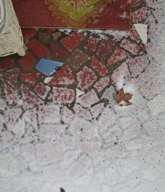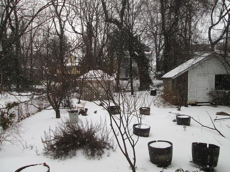 We’re in the midst of the first full snow day of this storm. Five inches with a layer of ice first thing this morning, more snow coming down now at noon with several more inches expected. My husband is a help desk tech and is set up in the next room taking calls on his laptop. I get to hear what he actually does for a living today, although he says that it is a very slow day for him. The kittens are excited that he is here doing something different.