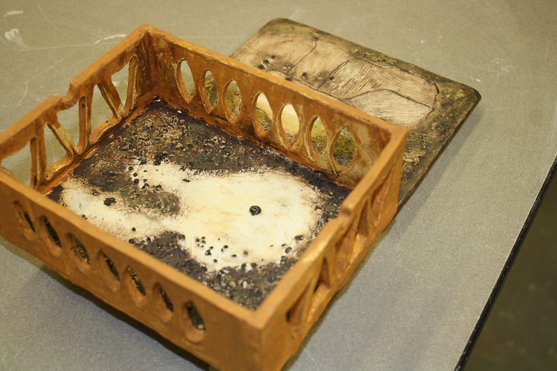 I also was taking the last college art course of my degree, and created a ceramic box for the scroll. The lid of the box is a relief map of the farm from a satellite view. The bottom of the inside of the box is a relief map of what I imagine the same view might have been 900 years ago.