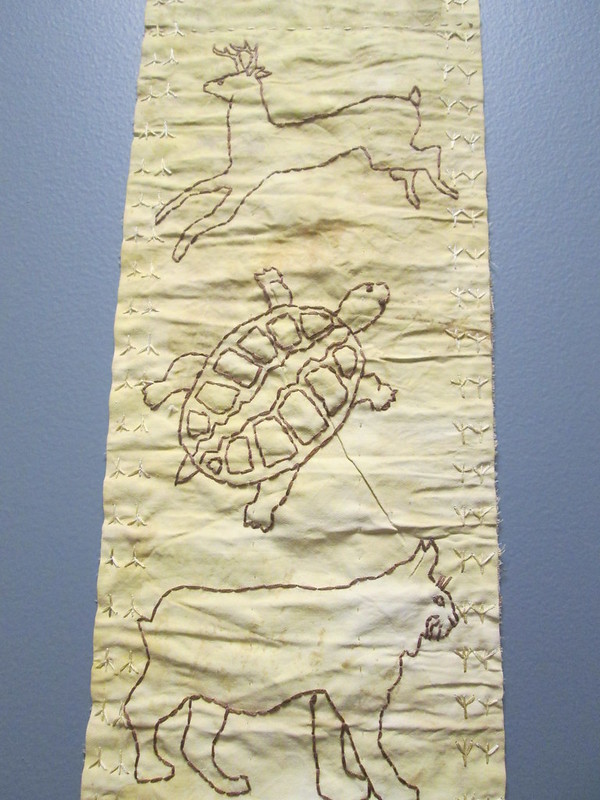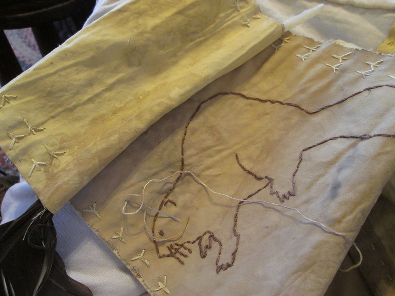 During the making of this project (which is still in progress), my brother told me that he had banned hunting on the farm and is in the planning stages of constructing an observation platform and feeding station for wildlife overlooking a beaver pond. This made me consider the lives of the other inhabitants of the land that have always been there. I began stitching outlines of these creatures on the scroll with silk dyed with black walnut hulls from the farm.