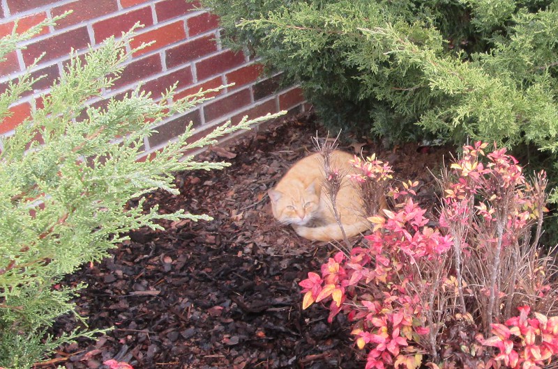 I discovered where this fine feral feller likes to hang out and started leaving him a little cat food on my walks by these bushes on my way to work. I first saw him this past fall and I’ve worried about him in the bad weather. Hopefully someone nearby has been caring for him over the winter because he looks pretty healthy. What shall I call him? I’m thinking “George.”