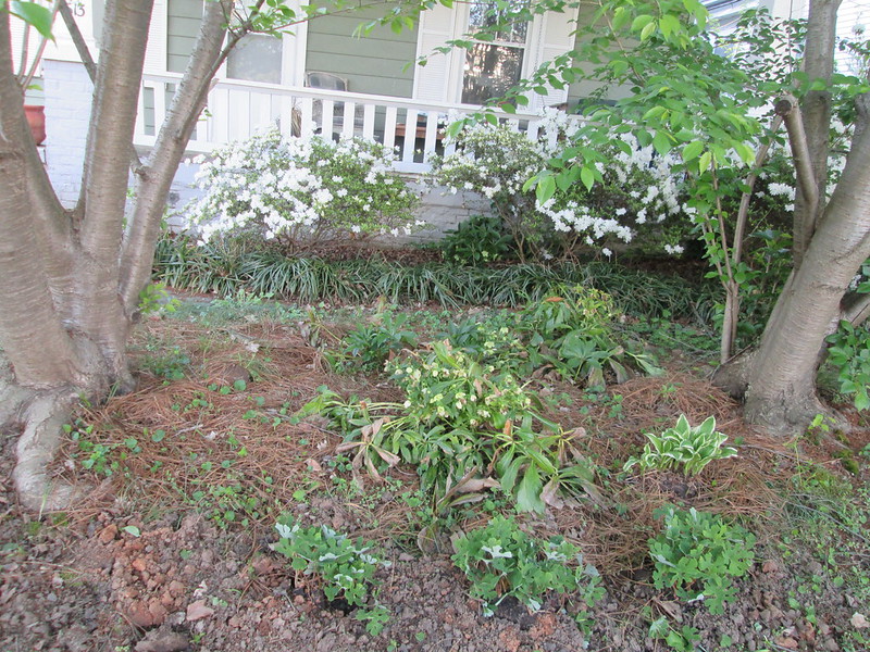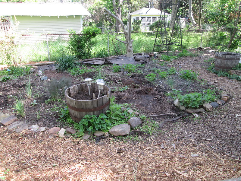 I know that I won’t be able to achieve cleaning up the entire yard this year so I have changed my goal to concentrating on this part of the yard and the front yard. I’m going to put pine needles around the fig tree and the swing. Growing in this area now: alpine strawberries, borage, parsley, bronze fennel, red violetto artichoke, French sorrel, red sorrel, blueberries, garlic from last year. I still have some weeding to do. I think that I will plant some green beans or shell beans here, and field peas. I bought chicken wire to protect them from rabbits this year.