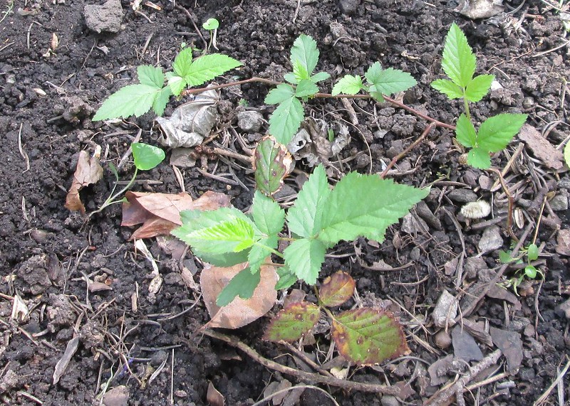 After weeding out the violets and digging up the dead rosemary bush I found what I think might be a blackberry volunteer.