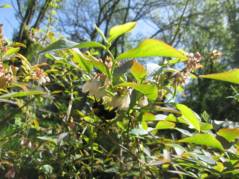 Bees are busy on the blueberry bush.
