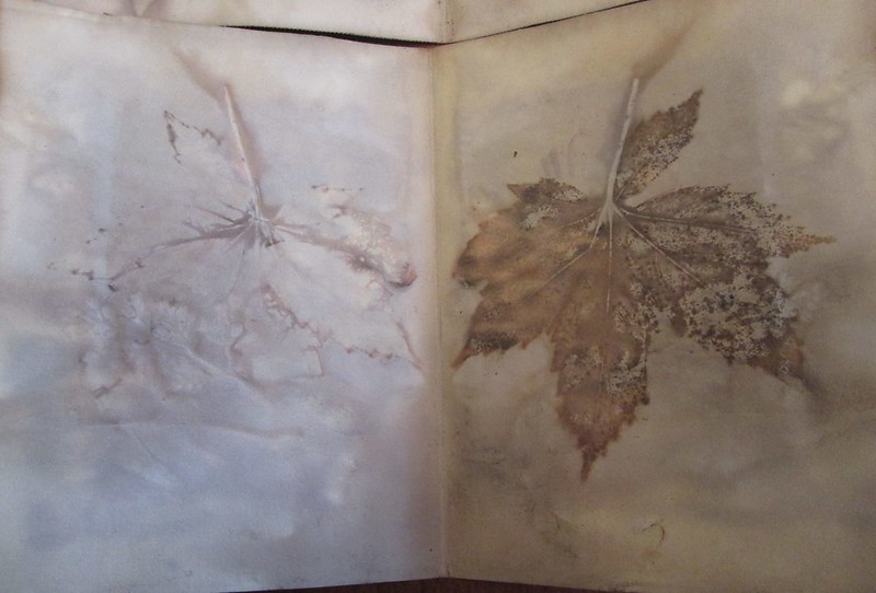 I walked around the yard between storms and collected as many different fresh leaves as possible, combined them in a folded accordion book with some metal pieces that I’ve collected, and steamed the book, then immersed it in a dyebath with privet leaves and flowers and bald cypress needles in lake water. I figured that the bald cypress needles and lake water would provide enough tannin to create a mordant.