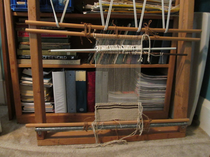 Anyway, I finally figured out a way to have my tapestry loom in a small space where I can protect my weaving from those little… animals. We just put carpet down in this room and I got rid of a lot of stuff and rearranged things. We have a beautiful room divider that we bought a long time ago and there wasn’t a good place for it until now. It is very heavy and it leans up against a board against the bookshelf, making a protected space behind for this tapestry loom I bought when the Center for Creative Arts eliminated their weaving program over a year ago.