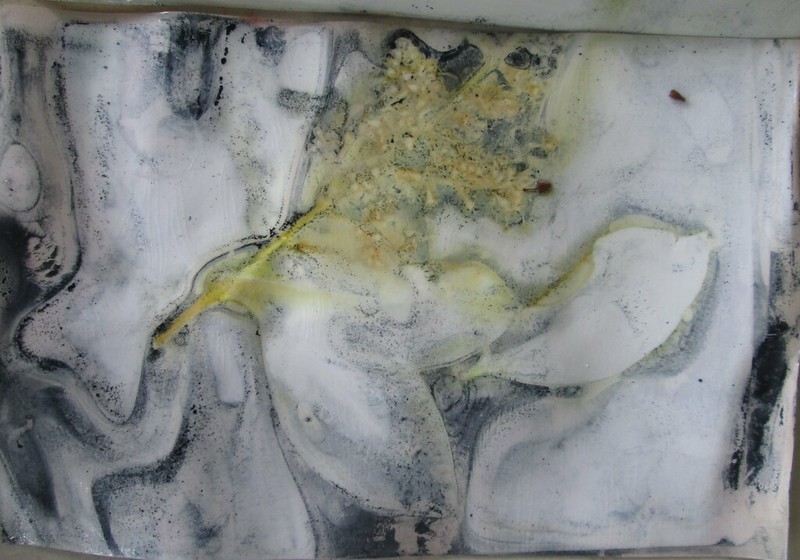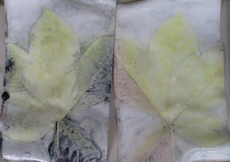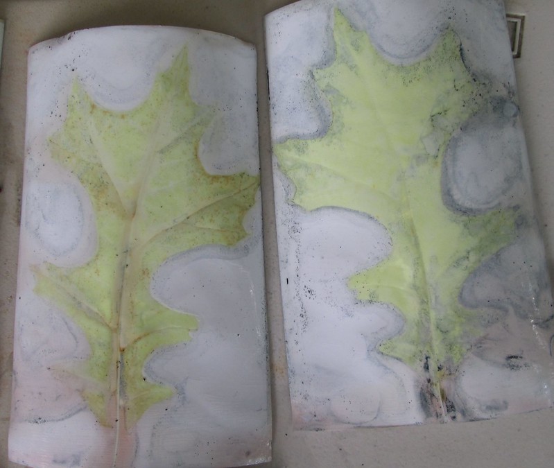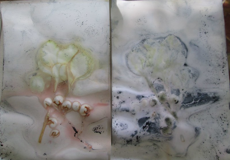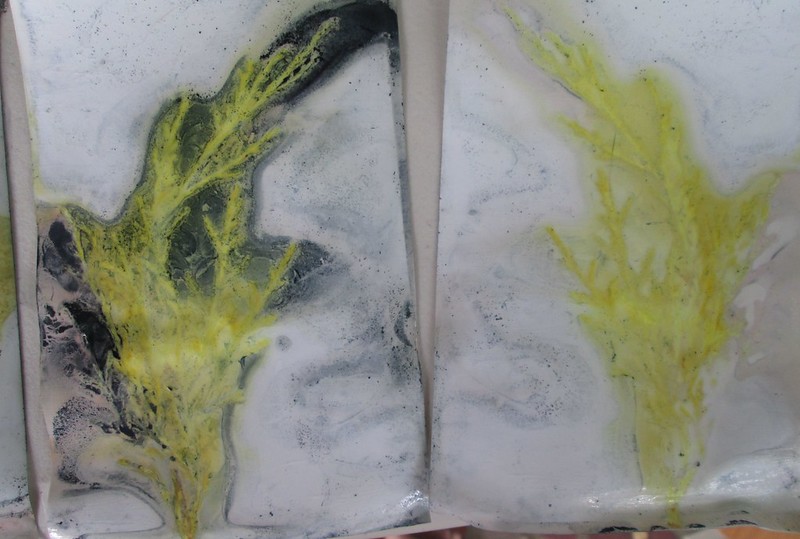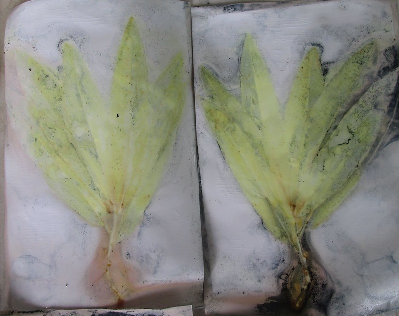 Since I am not to let a hot pot of old dye go to waste, I boiled a bundle of glossy photo papers layered with leaves and bound between ceramic tiles at the bottom of what was left in the indigo solution and got some great results. I learned this method from Marilyn Stephens at Interlaced-Textile Arts. I would not have considered using this photo paper for plant prints, but it was bought long ago and gathering dust and probably would not have ever been used. These are all plants that I pass on my walk to work twice a day. I’m not sure whether the indigo will rub off the paper or not, but here are the photos.